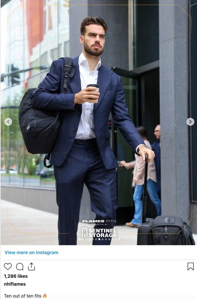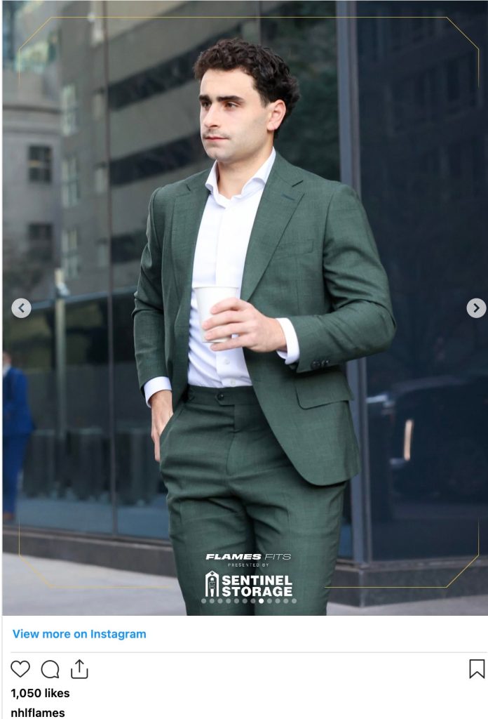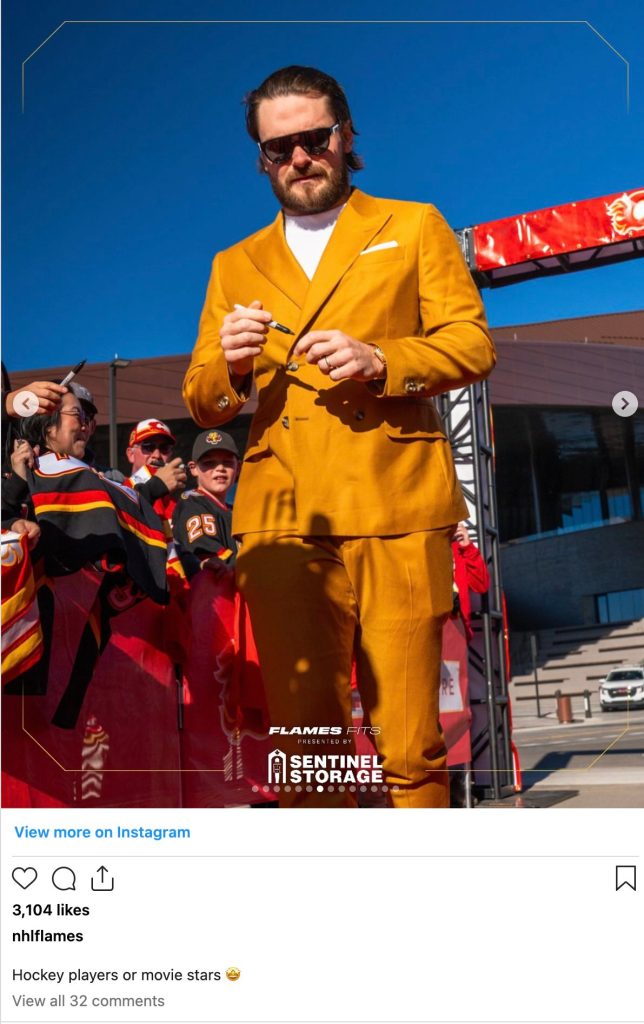 Now this is not something you’d see on your way to the game. Unless you’re on the Flames red carpet, of course! Rasmus Andersson is another player who has some great outfits. He’s not afraid to step out of the traditional colours and step into the bold jewel tones. Andersson is a flashy player on and off the ice. This is definitely a contender for look of the year.