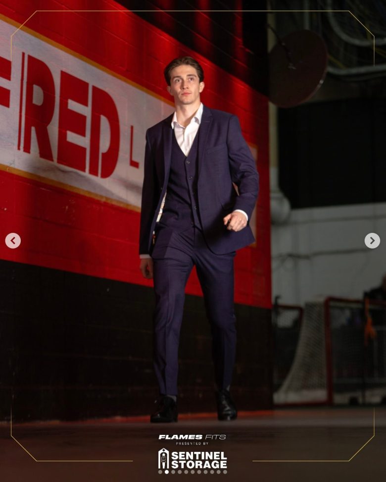 A common theme is that Dustin Wolf always has a drink in his hand. Sometimes you might find a little snack too! Wolf has some of the best suits amongst the goalies. His powder blue one is consistently in rotation, but this checkered burgundy number beat it out. It is tailored and fits him like a glove. The navy tie and pocket square do their job, complementing the burgundy. He should give his tailor’s phone number to his teammates.
