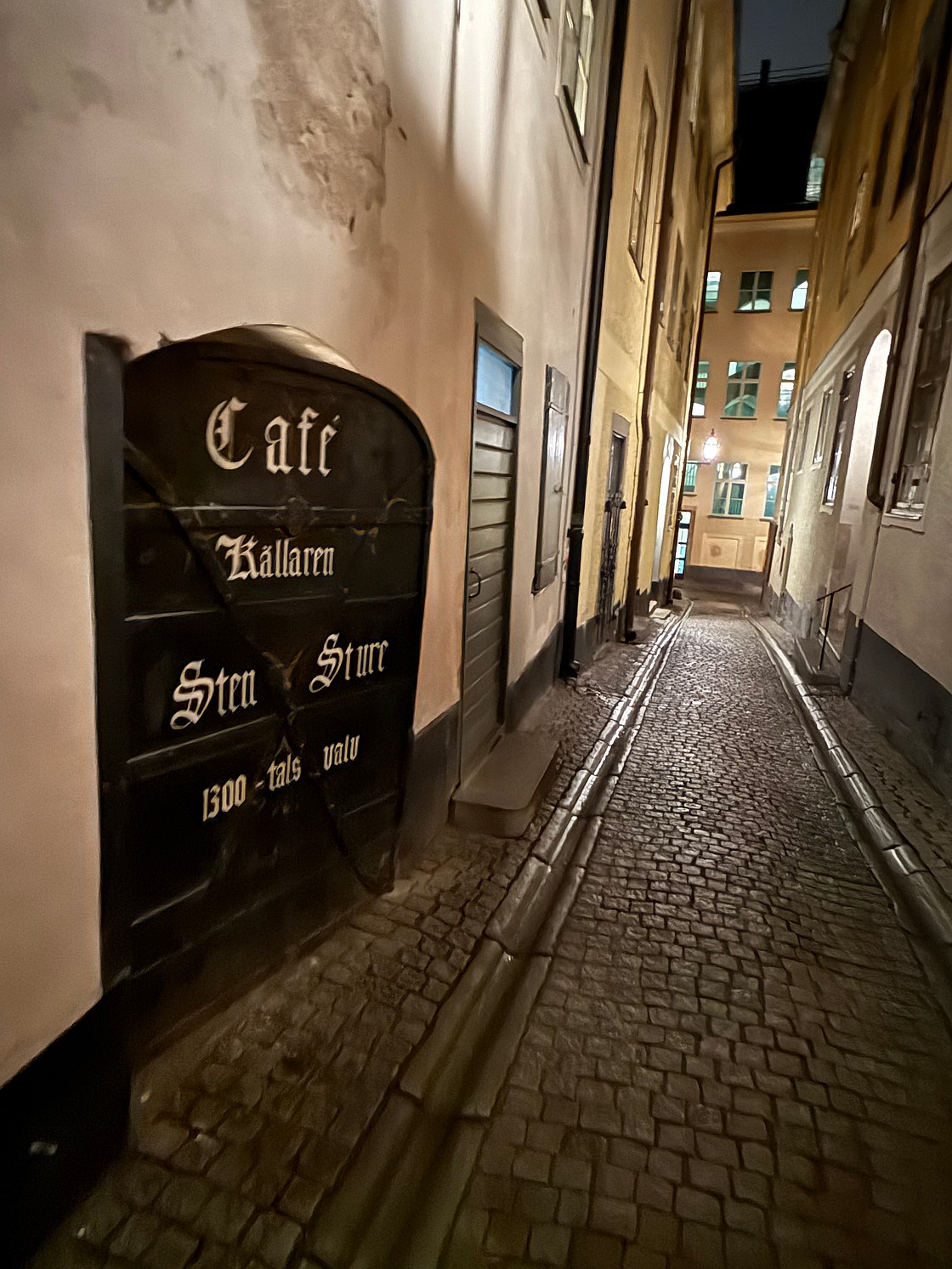 And, I dined in the “King’s Restaurant” near the palace. A little, quiet place. A table to myself with a candle. Absolute heaven. I had Reindeer in Black Currant. Absolutely incredible. The owner kept checking with me–making sure I liked it, but I loved it. With a small tip, the total was $54. I broke my per diem, but for that meal, it was very, very worth it. Then I wandered down an alley and found a 14th-century prison with a heavy iron door that is now a wonderful little cafe with the original stone floor. I’ll post more of those pictures in the travel blog.