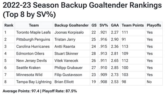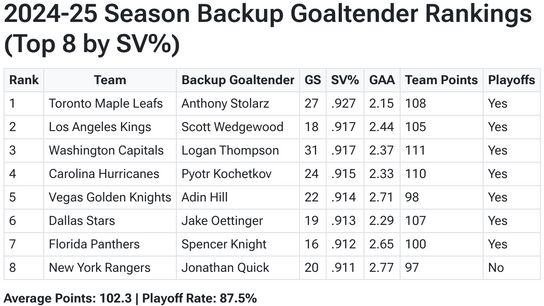 Top 8 Teams (by Backup SV%): Averaged 102.3 pointsRemaining 24 Teams: Averaged 91.8 pointsPoint Differential: +10.5 pointsTop 8: 7 of 8 teams (87.5%) made the playoffsRemaining 24: 9 of 24 teams (37.5%) made the playoffs