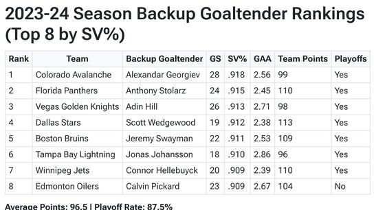 Top 8 Teams (by Backup SV%): Averaged 96.5 pointsRemaining 24 Teams: Averaged 87.3 pointsPoint Differential: +9.2 pointsTop 8: 7 of 8 teams (87.5%) made the playoffsRemaining 24: 10 of 24 teams (41.7%) made the playoffs