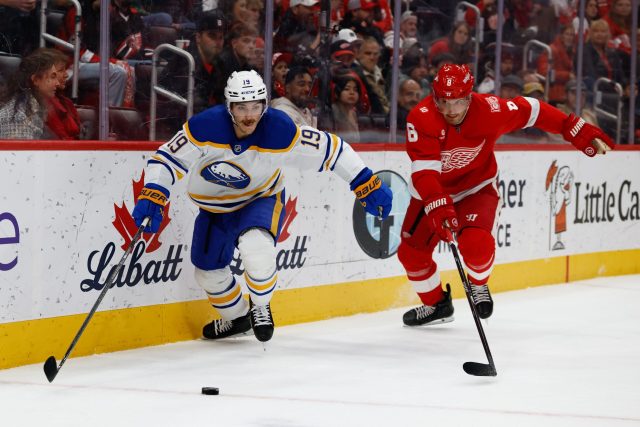 Nov 15, 2025; Detroit, Michigan, USA; Buffalo Sabres center Peyton Krebs (19) skates with the puck defended by Detroit Red Wings defenseman Ben Chiarot (8) in the first period at Little Caesars Arena. Mandatory Credit: Rick Osentoski-Imagn Images