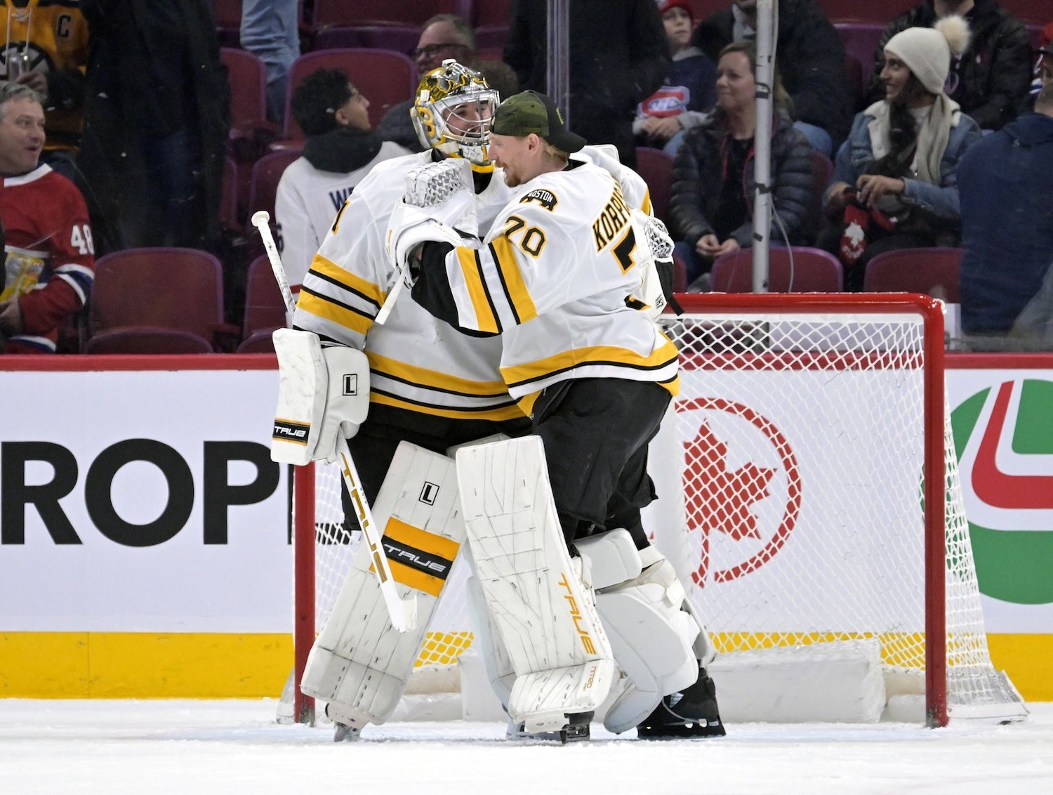 Nov 15, 2025; Montreal, Quebec, CAN; Bruins goalie Jeremy Swayman (1) and teammate Joonas Korpisalo (70) celebrate the win against the Canadiens at the Bell Centre. (Eric Bolte-Imagn Images)