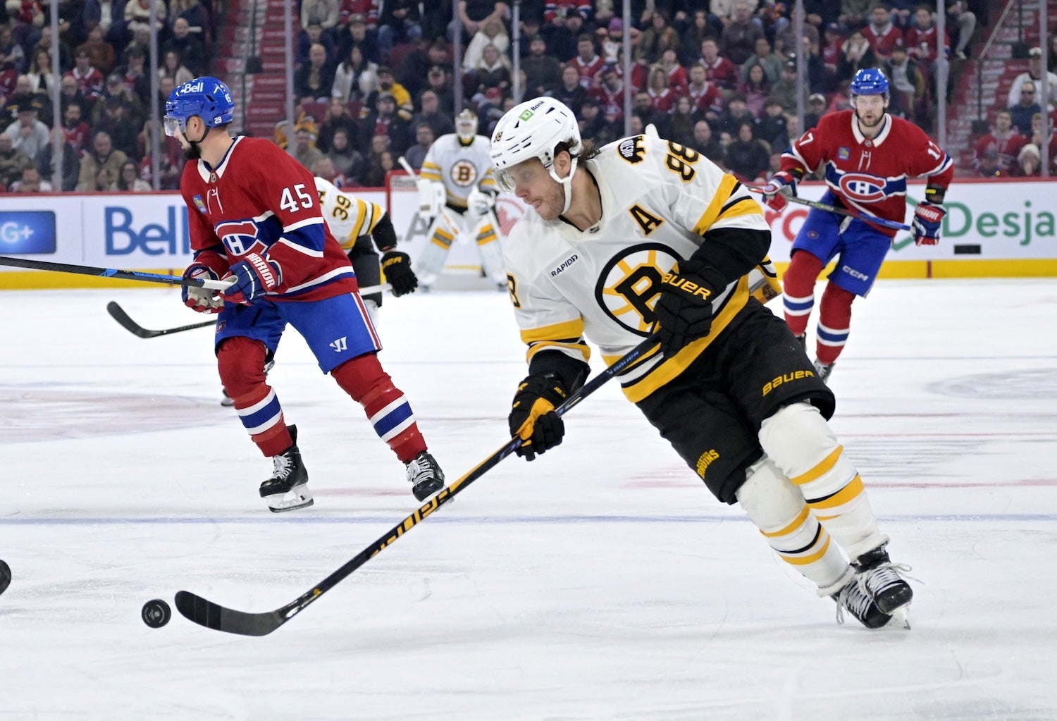 Nov 15, 2025; Montreal, Quebec, CAN; Bruins forward David Pastrnak (88) plays the puck during the third period of the game against the Canadiens at the Bell Centre. (Eric Bolte-Imagn Images)