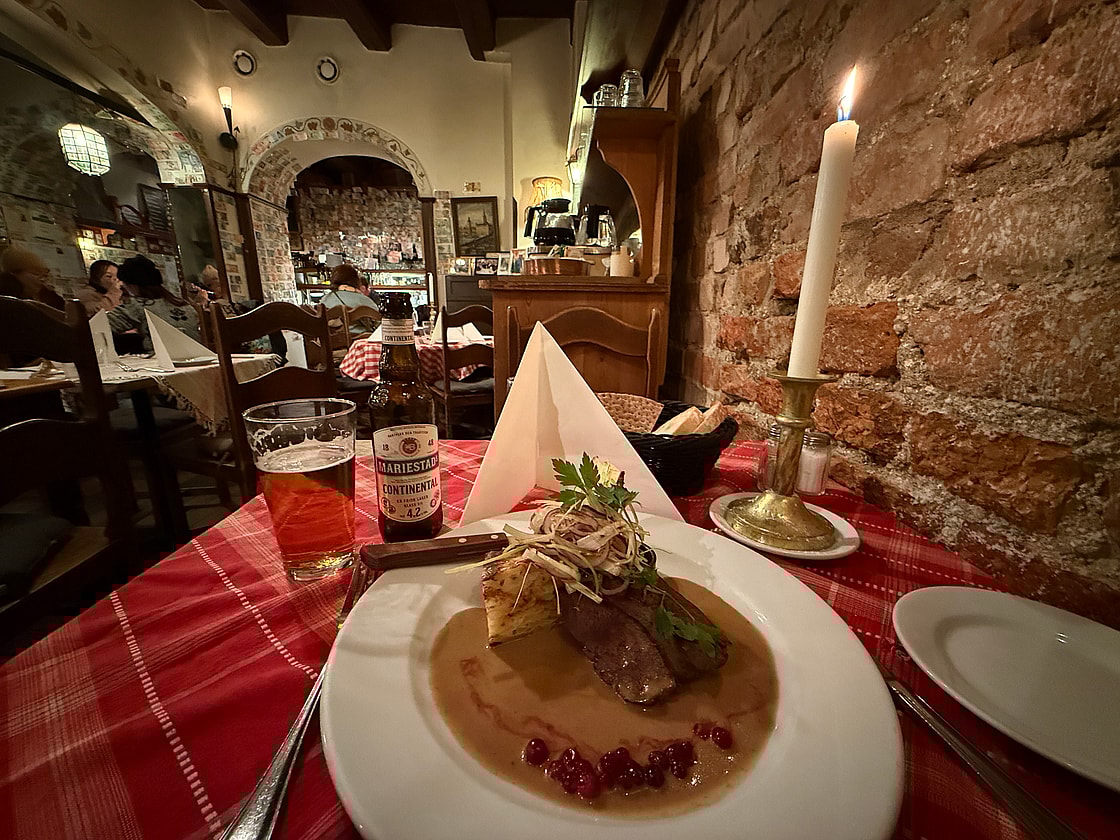 The reindeer in black currant at the King’s Restaurant in the shadow of the royal palace was nothing short of amazing. In a small place with real stone floors and stone arches, the food arrived and the owner checked on me often–I was excited to try the reindeer, but expressed some trepidation.