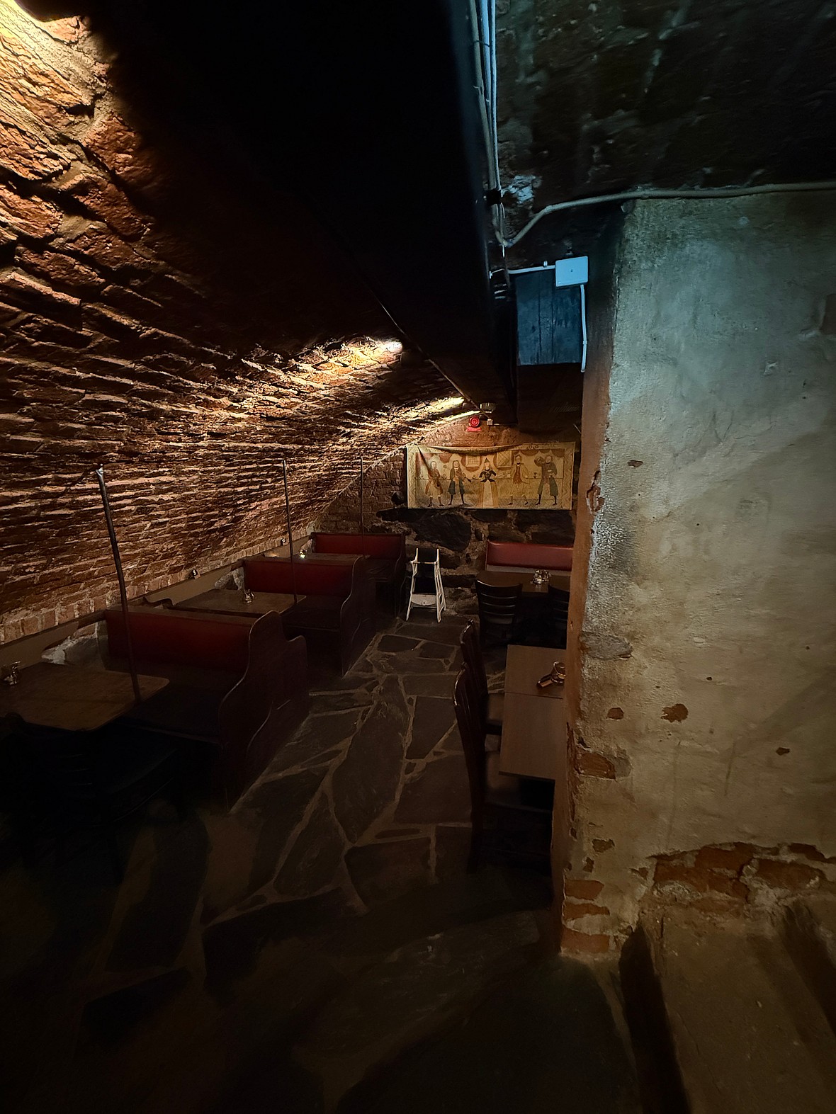 As the tourists traversed the wide street just a few meters away, I rolled around the corner into a narrow alley not much wider than the width of two people, and saw a heavy iron door that was slightly ajar. I peered in and saw medieval steps and a dark basement cafe.