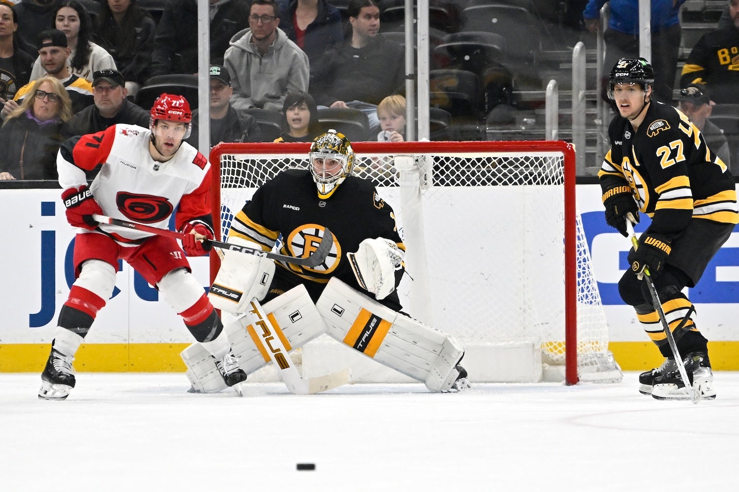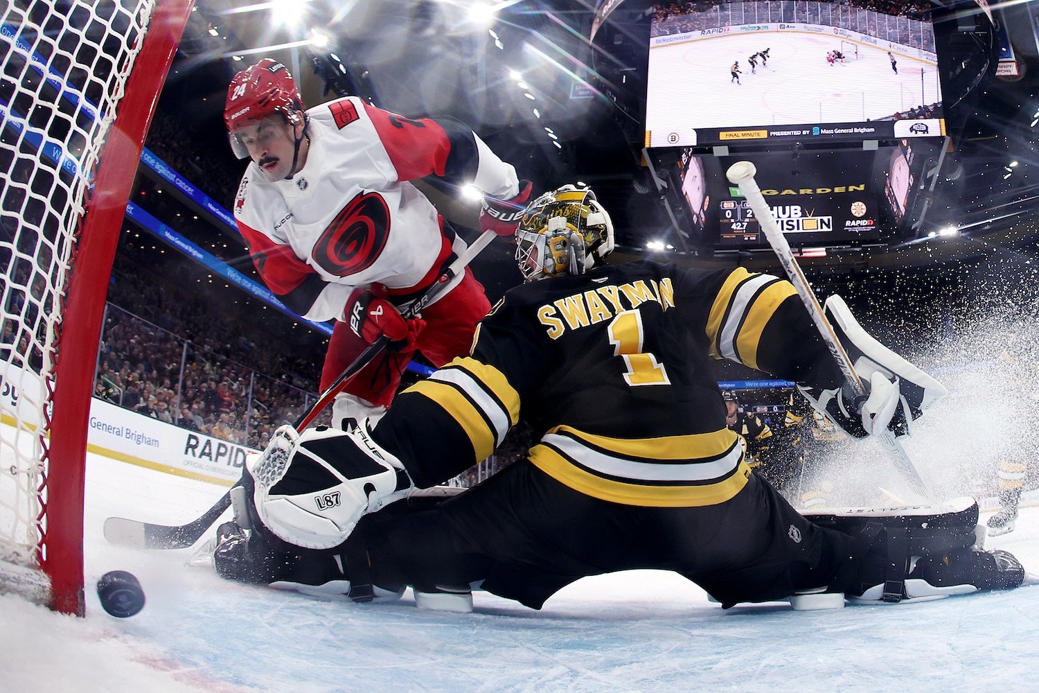 After stopping all 10 shots faced in the opening period, Swayman began his second period with eight straight saves before a Jordan Staal netfront putaway finally put Carolina on the board at the 8:25 mark of the frame.