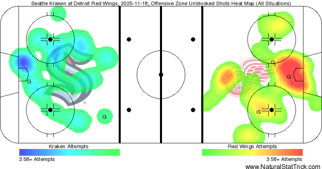 The Kraken Power Play has been pretty good through the last 19 games…but that’s only doing modest cover for the five alarm fire that the penalty kill has become, and it was very much the difference for Detroit in this one. It’s easy to blame it in general for much of the Kraken’s overdramatic nature this season, but it does bear mentioning given how routinely it fails them and forces them into positions where they have to go find a goal or survive a major push from the other team. If it was even a little bit better then maybe we’re talking about another OT game? It’s gotta be another point of pain for practice as well.
