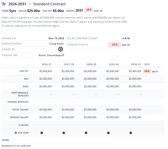 The center will be 33 yrs old when the new deal kicks in next season, so he won’t have the chance to hit free agency again until the forward is 38 yrs old. Lowry becomes the 4th core member to be locked up by the Jets into their late 30’s, joining the previously mentioned Connor, Mark Scheifele, & Connor Hellebuyck.