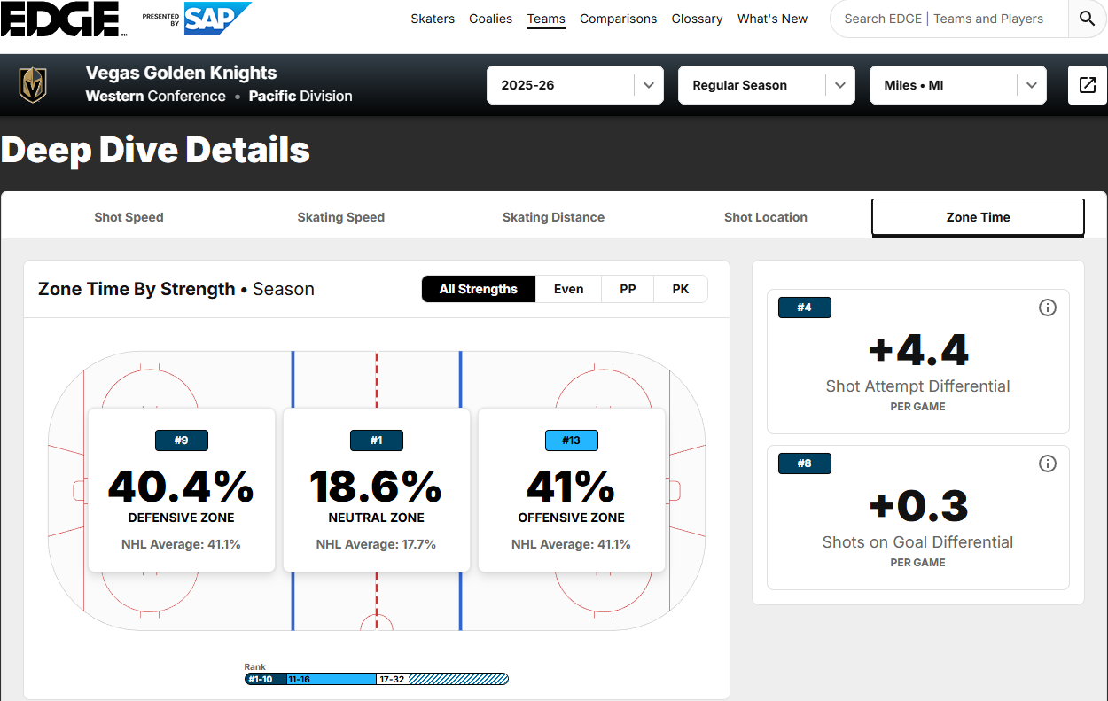 It’s nothing new, but the 9-4-6 Golden Knights have established themselves as a strong possession team. It’s been a constant under the Bruce Cassidy era and has continued into this season. NHL EDGE statistics currently rank the Golden Knights 1st in neutral zone possession. Vegas is a full point above league average.