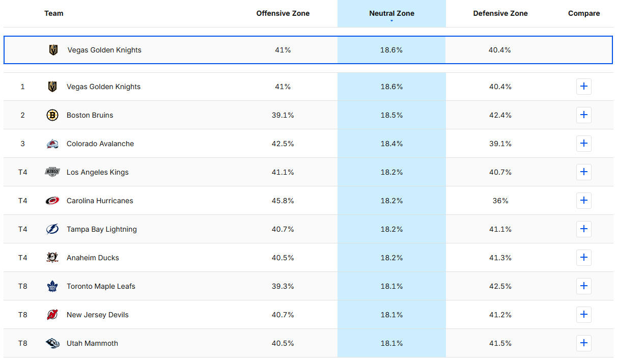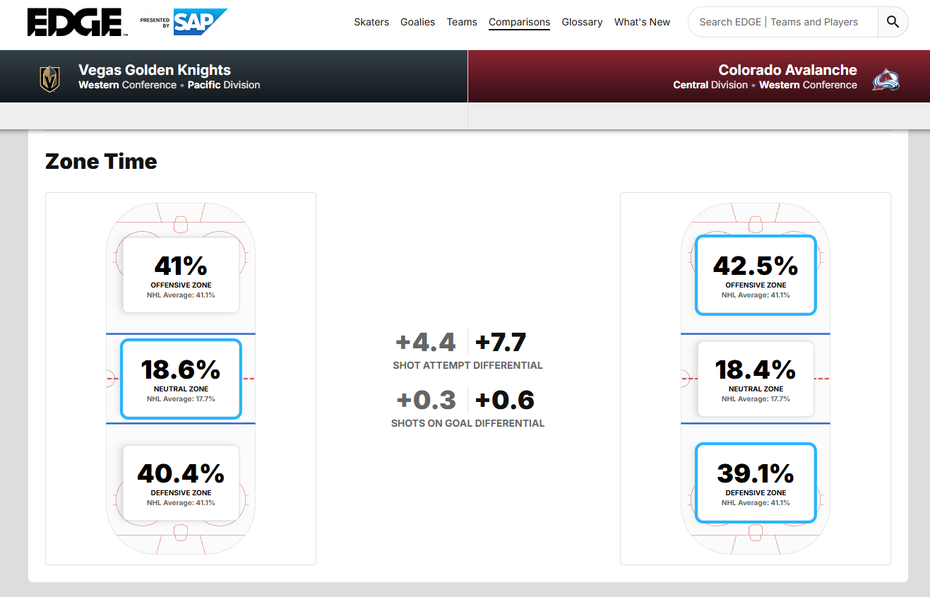 Overall, Vegas compares well with the Pacific’s and Western Conference’s heavyweight opponents. The Golden Knights lead the Anaheim Ducks in all three zones and edge out the Edmonton Oilers in both the neutral and offensive zones. Those two divisional rivals could be what stands in the way of the first or the third seed in the Pacific.