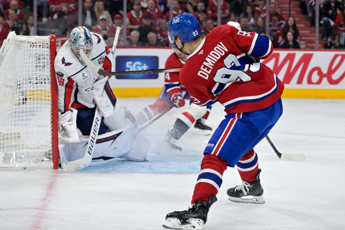 Apr 25, 2025; Montreal, Quebec, CAN; Washington Capitals goalie Logan Thompson (48) makes a save against Montreal Canadiens forward Ivan Demidov (93) during the second period in game three of the first round of the 2025 Stanley Cup Playoffs at the Bell Centre. Mandatory Credit: Eric Bolte-Imagn Images