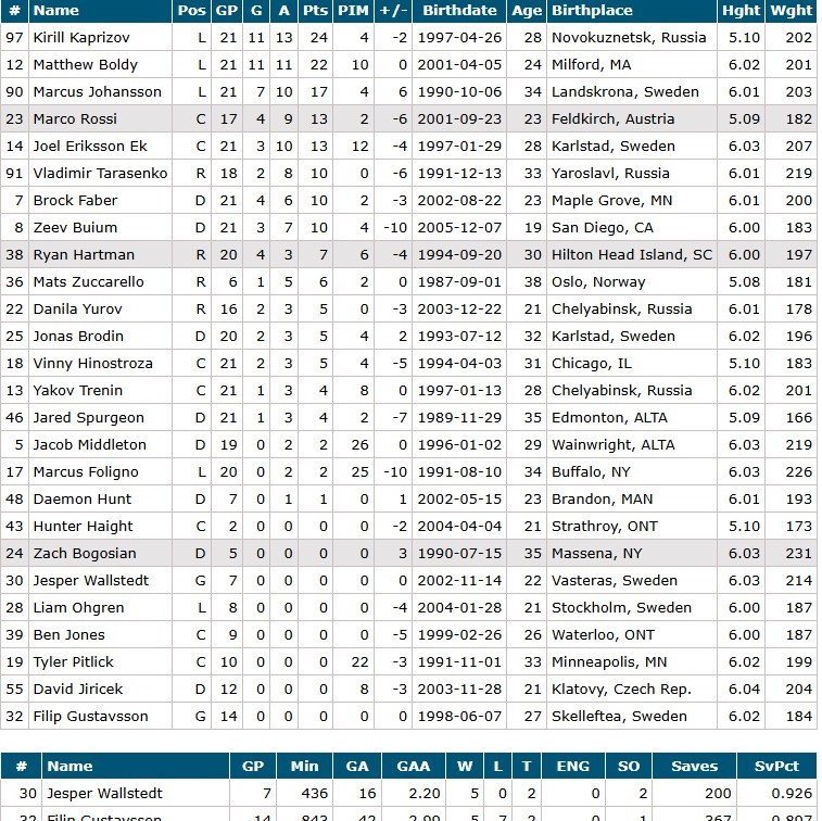 There’s been some IR movement from a couple of weeks ago during the last MIN/PIT game; Zuccarello is back from IR but Hartman, Tarasenko and Rossi have made their way to the injury bay since the last team Pittsburgh has seen the Wild.The top two lines have been putting in work since Zuccarello’s return six games ago. Between Boldy and Kaprizov both of the scoring lines have balance and power, capable of scoring and providing the offense that a team needs to win games.Heat check alert: Boldy has four goals in the last five games, Zuccarello has four assists in the last five.It’s always funny (when it’s not your team at least) when the goalie who gets paid a lot of money ends up performing worse than the other goalie on the team. Such is the case so far with Minnesota locking in Gustavsson ($6.8m cap hit starting next year) compared to the youngster in Wallstedt who looks to be living up to his potential as one of the top prospect goalies over the past few years. I’m sure they don’t regret it yet or anything but that quirk always seems to pop up.