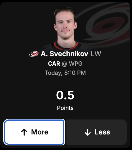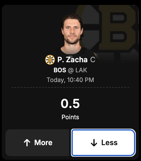 Create a Pick Set by choosing 2+ players from the same sport and Pick Group (a set of picks available from a group of set competitions). For each player, simply select if you think they’ll have more or less than their listed stat projection. In each Pick Set, you can not pick the same player twice and you must pick players from at least two different teams.