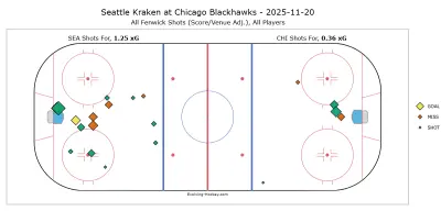 The Chicago Blackhawks started the night strong and followed that effort with their best second period of the season. They dominated 5-on-5 possession with a 75.86% Corsi and quality scoring chances with a 65.8% expected goals share. Heading into the third period, the Hawks had a 2-0 lead against a Kraken team that has struggled to generate offense all season. And they handed the game to Seattle.