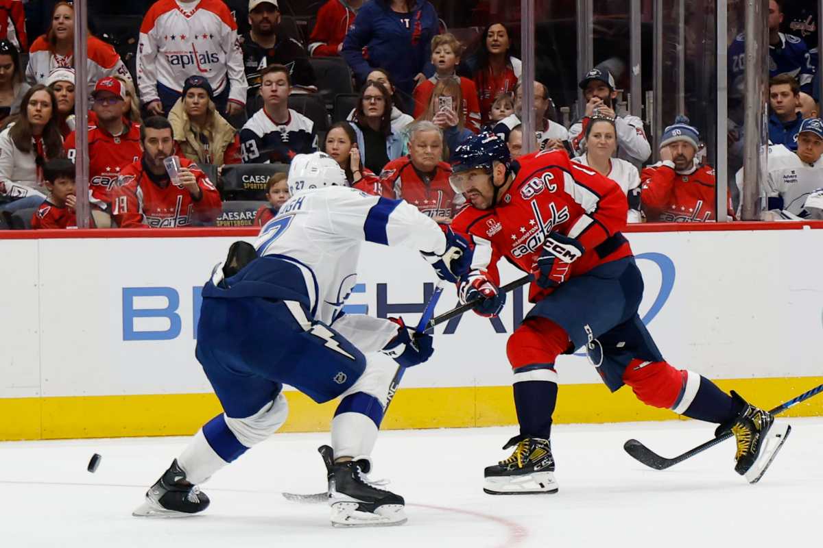 Mar 1, 2025; Washington, District of Columbia, USA; Washington Capitals left wing Alex Ovechkin (8) shoots the puck as Tampa Bay Lightning defenseman Ryan McDonagh (27) defends in the third period at Capital One Arena. Mandatory Credit: Geoff Burke-Imagn Images