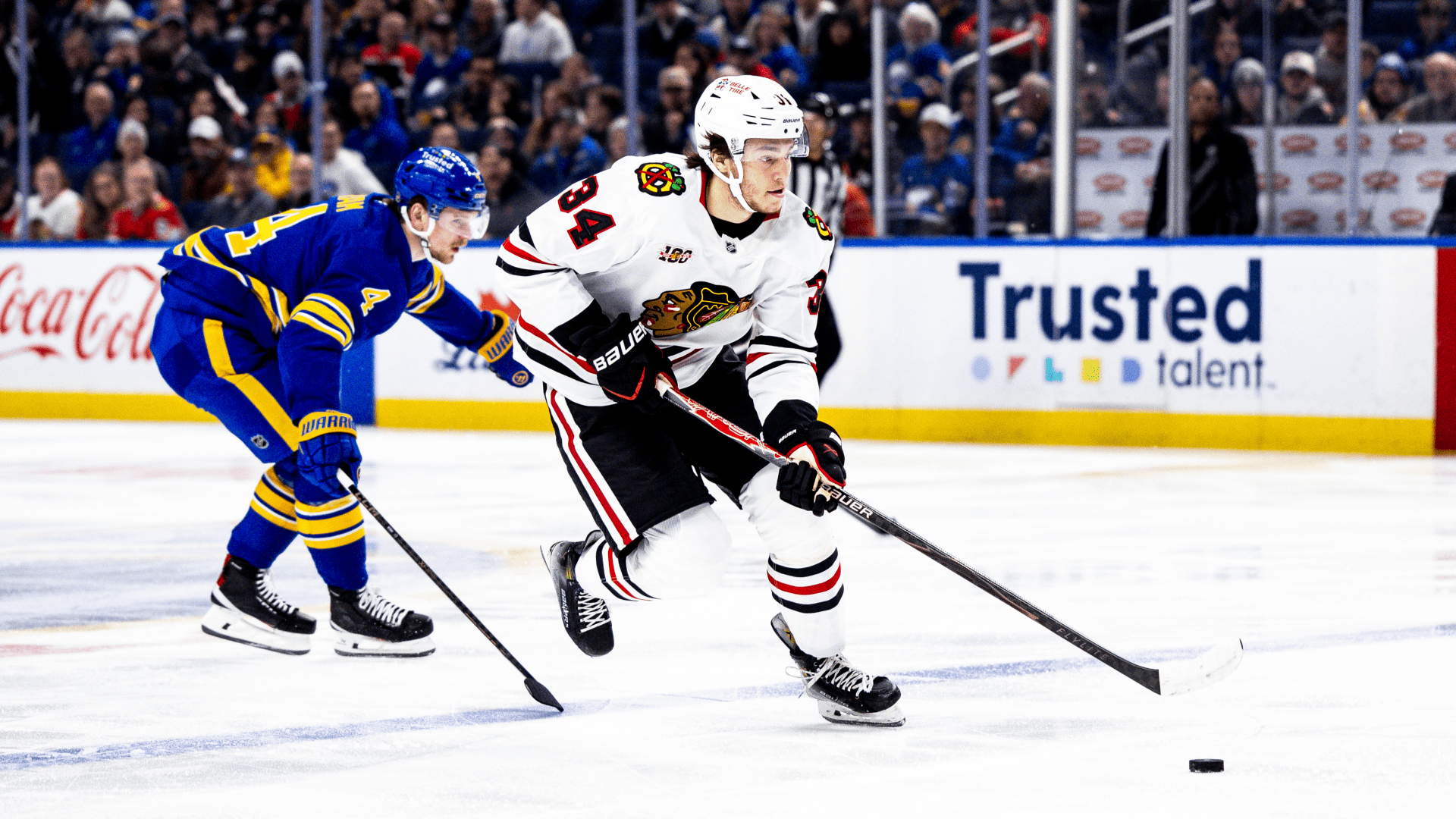 Colton Dach carries the puck during the Chicago Blackhawks’ 9-3 loss to the Buffalo Sabres on Friday night. (Photo courtesy of the Chicago Blackhawks)