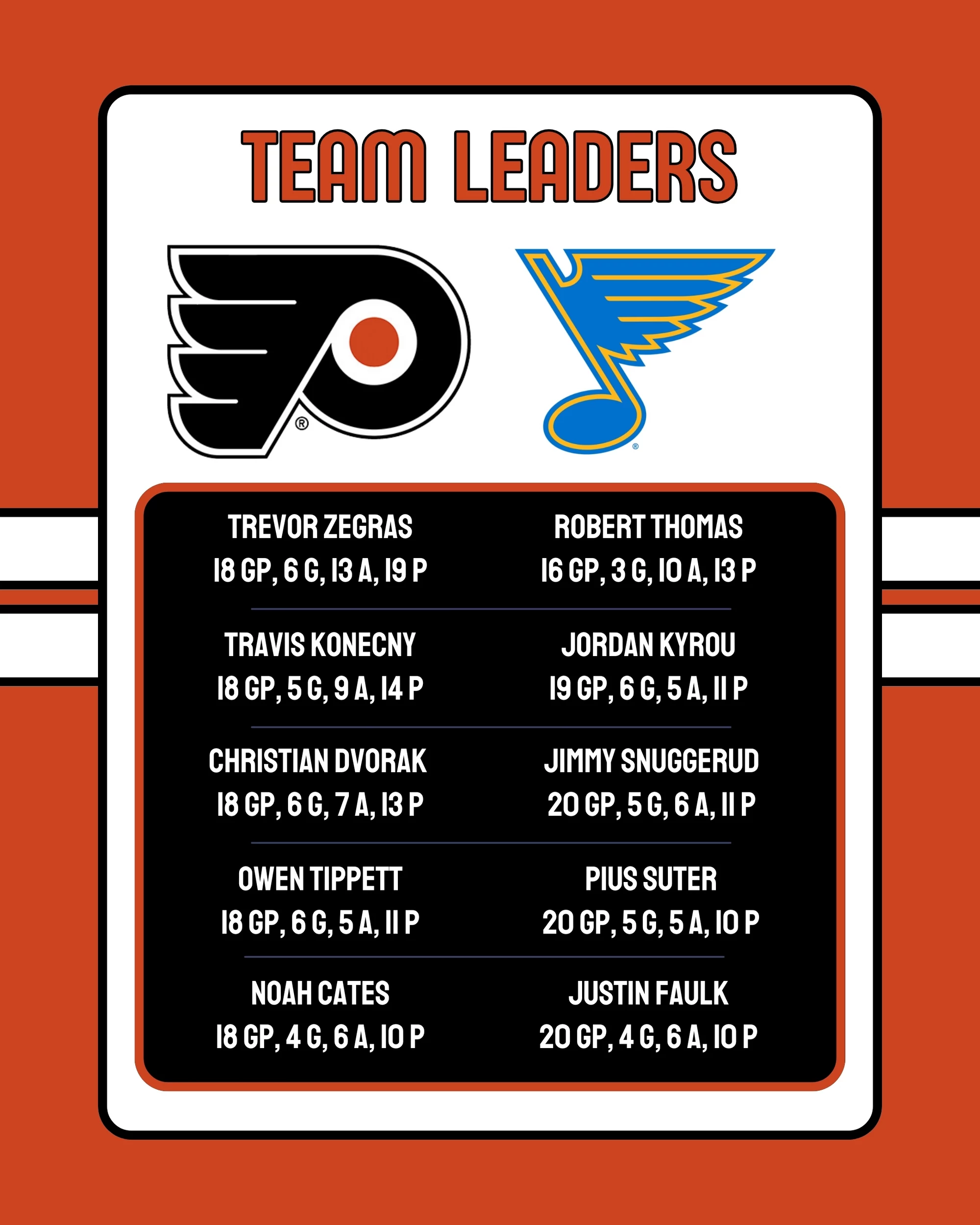 Robert Thomas now leads the way for the Blues with 13 points on the season. He has four points on a three-game points streak and five points in his last five games.