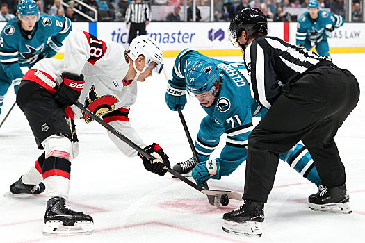 Linesperson Brandon Gawryletz drops the puck on a faceoff between Tim Stutzle (18) and Maklin Celebrini (71) – Photo by Jack Lima