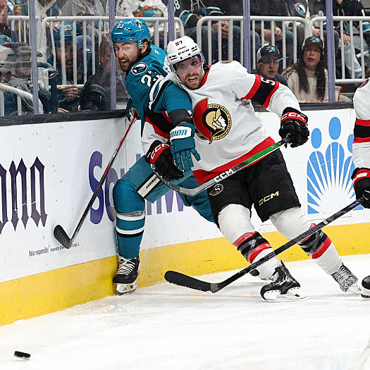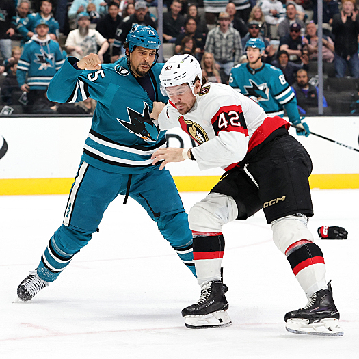 Senators forward David Perron (57) pins Sharks Barclay Goodrow (23) against the boards – Photo by Jack Lima