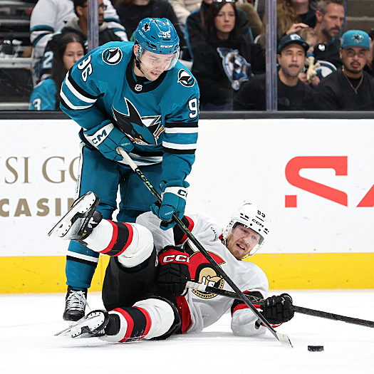 Sharks forward Maklin Celebrini (71) fights for the puck with Senators forward Claude Giroux (28) after a faceoff – Photo by Jack Lima