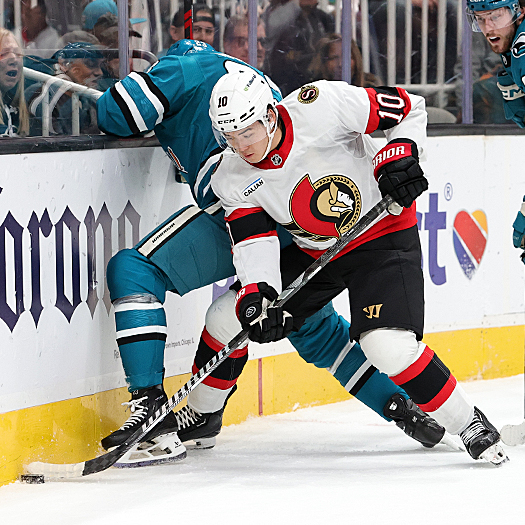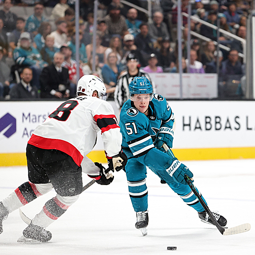 Sharks forward Colin Graf (51) attempts to move around Senators defender Tim Stutzle (18) – Photo by Jack Lima