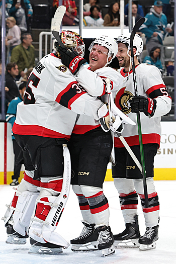Senators goalie Linus Ullmark celebrates the Senators win with teammates Fabin Zetterlund (center) and David Perron (right) – Photo by Jack Lima