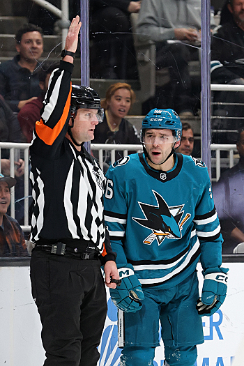 Sharks center Philipp Kurashev argues a penalty call with the referee – Photo by Jack Lima