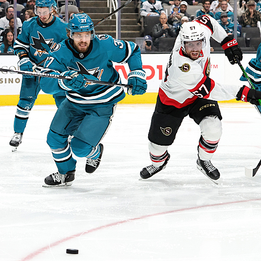 Sharks defenseman Mario Ferraro (38) and Senators forward David Perron (57) chase after the loose puck – Photo by Jack Lima