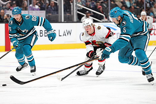 Sharks defensemen Shakir Mukhamadullin (85) and Vincent Desharnais (5) race Senators forward Fabian Zetterlund (2) for the loose puck – Photo by Jack Lima