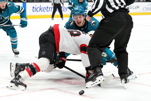 Senators center Lars Eller (89) battles Sharks center Philipp Kurashev (96) for control of the puck – Photo by Jack Lima