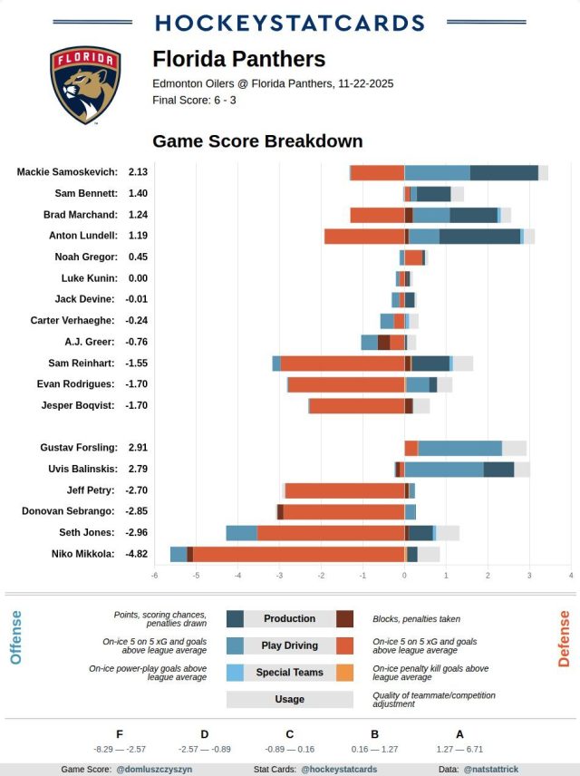 The Panthers would test Skinner 17 more times to no avail and Connor McDavid, from Ekholm, and Matt Savoie, assists to Mattias Janmark and Ekholm, would tack on empty-netters late in the third to complete the scoring.