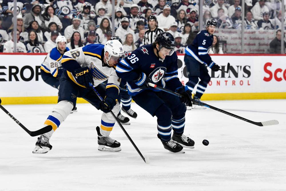 St. Louis Blues’ Radek Faksa (12) checks Winnipeg Jets’ Morgan Barron (36) during second period NHL playoff action in Winnipeg, Monday April 21, 2025.