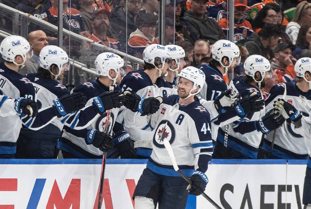 Winnipeg Jets’ Josh Morrissey (44) celebrates a goal against the Edmonton Oilers during second period NHL action in Edmonton on Thursday, March 20, 2025. THE CANADIAN PRESS/Jason Franson