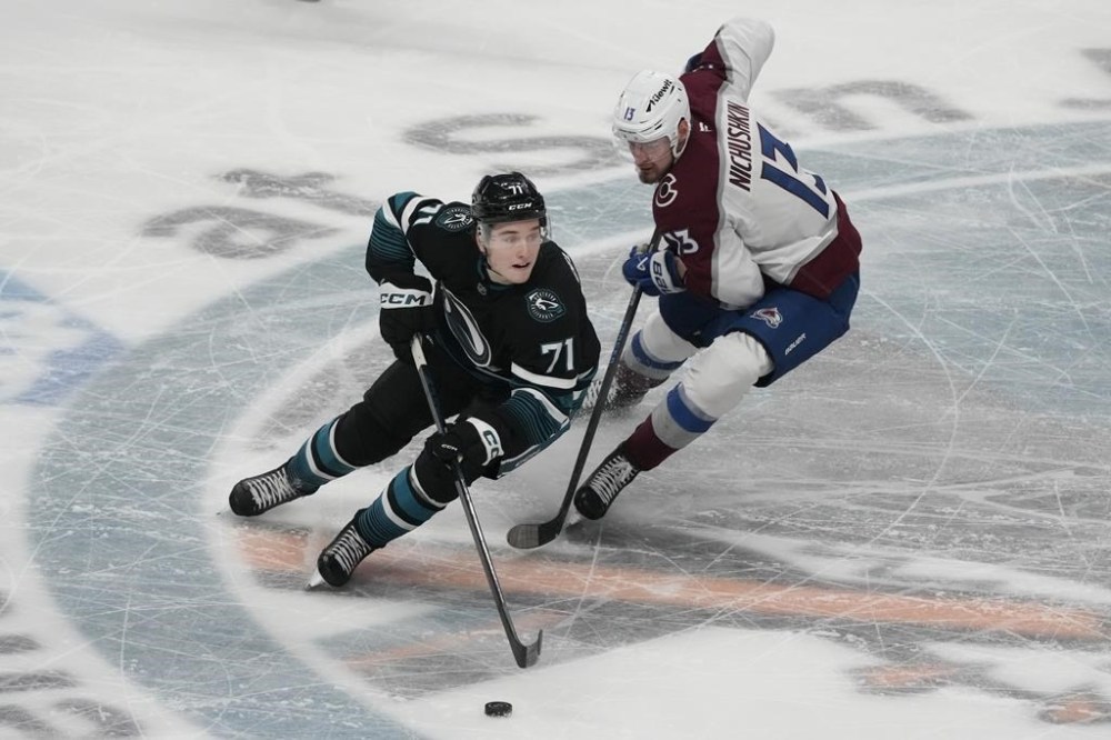 San Jose Sharks center Macklin Celebrini (71) skates with the puck against Colorado Avalanche right wing Valeri Nichushkin (13) during the third period of an NHL hockey game in San Jose, Calif., Thursday, Dec. 19, 2024. (AP Photo/Jeff Chiu)