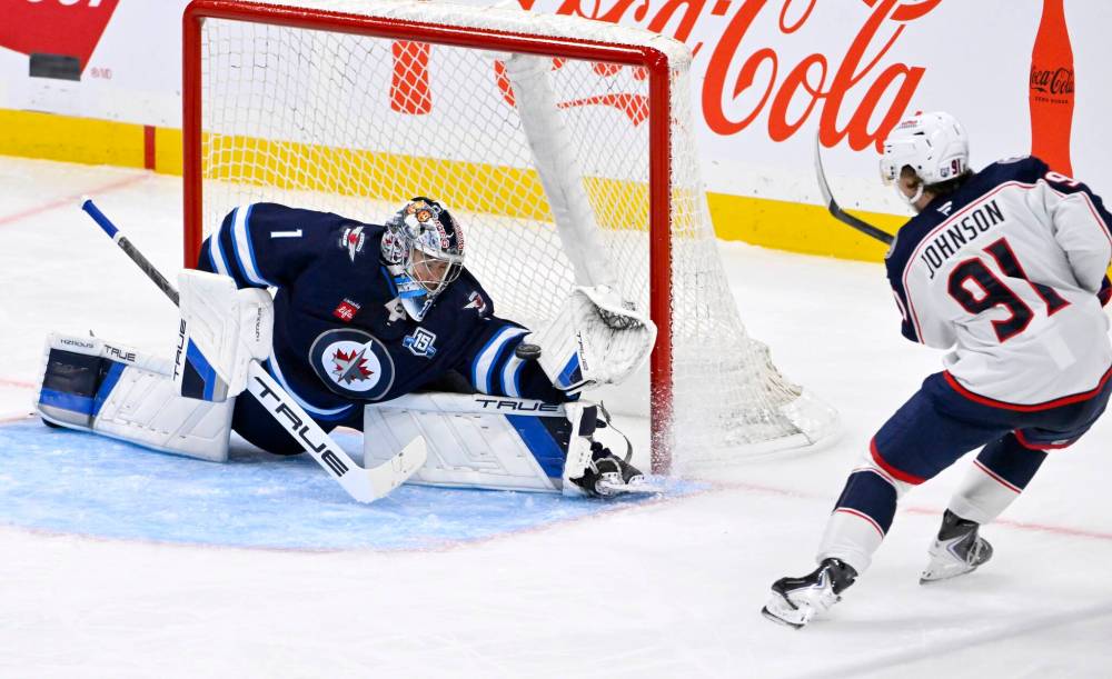 Jets goalie Eric Comrie stretches to thwart a third-period scoring chance from the Blue Jackets’ Kent Johnson.
