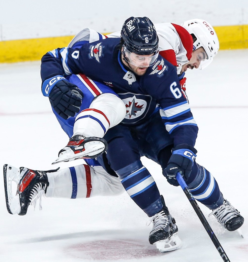 Montreal Canadiens’ Arber Xhekaj (72) tries to go over Winnipeg Jets’ Colin Miller (6) during third period NHL action in Winnipeg, Saturday, Dec. 14, 2024. THE CANADIAN PRESS/John Woods