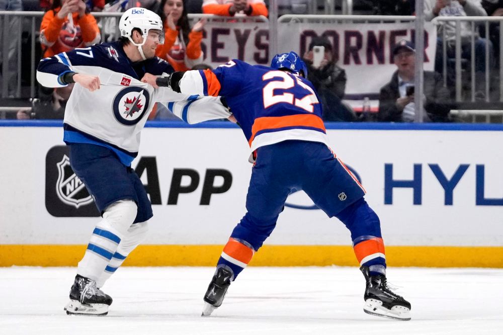 Winnipeg Jets’ Adam Lowry (17) fights with New York Islanders’ Anders Lee (27) during the first period of an NHL hockey game Tuesday, March 4, 2025, in Elmont, N.Y. (AP Photo/Frank Franklin II)