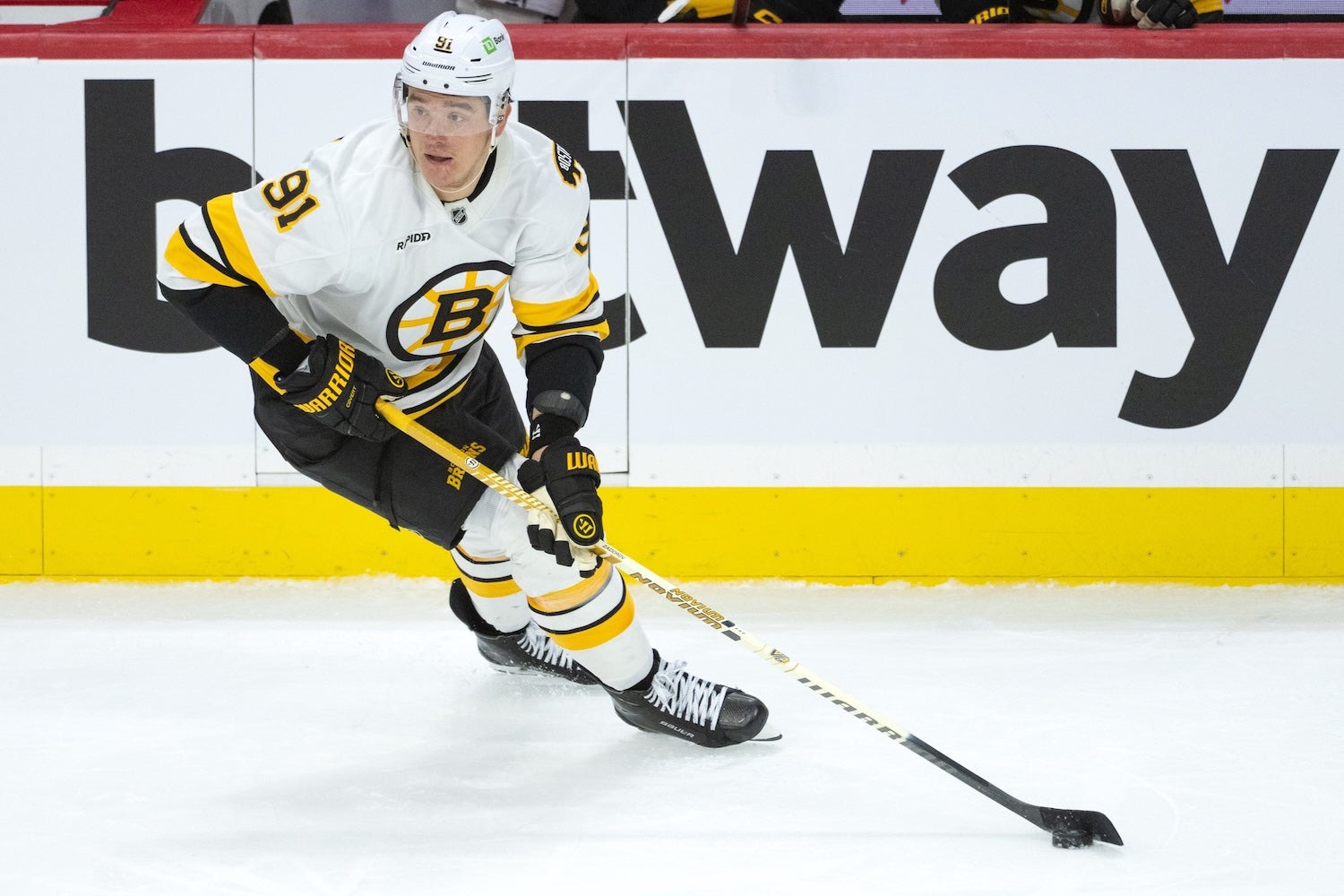 Oct 27, 2025; Ottawa, Ontario, CAN; Bruins defenseman Nikita Zadorov (91) skates with the puck in the third period against the Senators at the Canadian Tire Centre. (Marc DesRosiers-IMAGN Images)