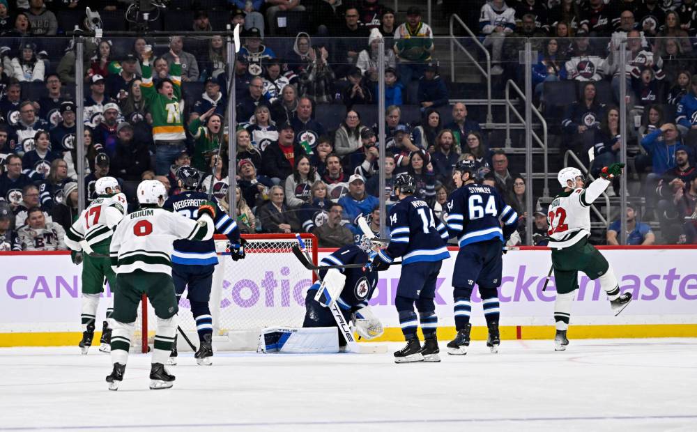 Minnesota Wild Danila Yurov (22) celebrates his goal against the Winnipeg Jets’ goaltender Eric Comrie (1) during second period. (Fred Greenslade / The Canadian Press)