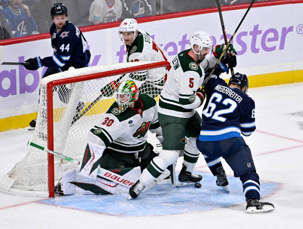 Minnesota Wild goalie Jesper Wallstedt (30) makes a save on Winnipeg Jets’ Gabriel Vilardi (13) as Jared Spurgeon (46) defends in first period. (Fred Greenslade / The Canadian Press)