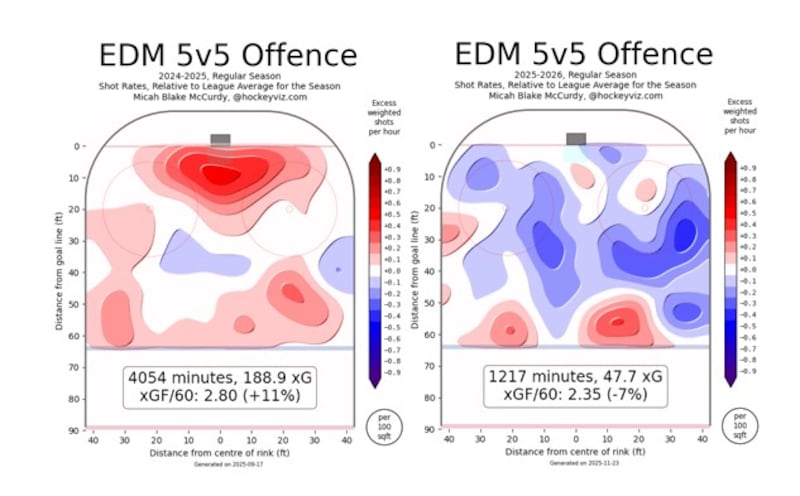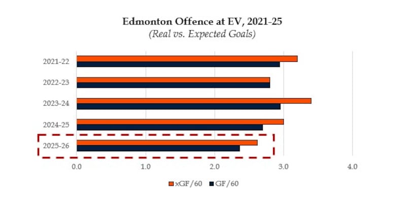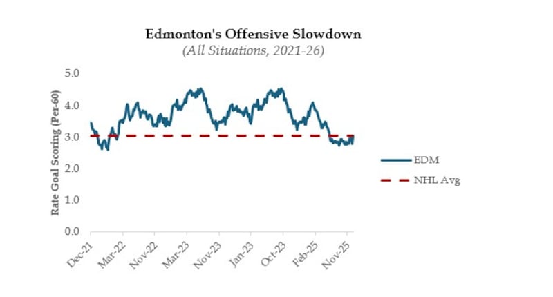 It’s been a concerning slowdown and doubly so when you start parsing the all-situations data. Edmonton’s power play has rebounded nicely after a cooler-than-usual 2024-25 season – they are averaging 11.0 goals per 60 minutes on the man advantage, which is still well inside of the top five across the NHL.