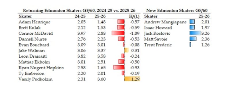 Every returning skater, with the exception of forward Vasily Podkolzin and defenceman Jake Walman, is realizing lower scoring rates, and for the new additions to the lineup, only Jack Roslovic has been able to beat the team averages: