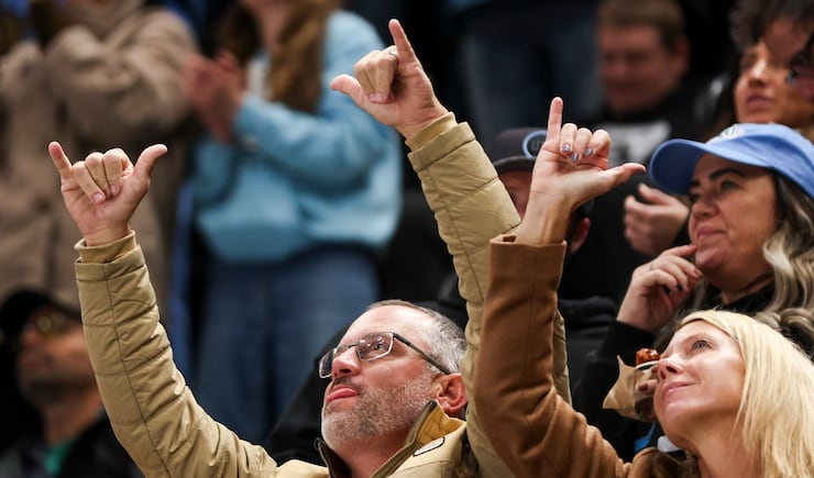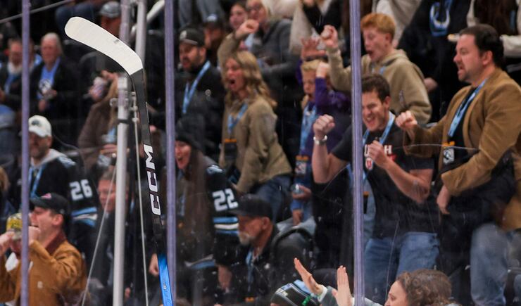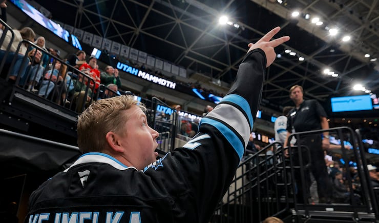 Fans celebrate after a goal by Utah Mammoth center Logan Cooley (92) during the third period of an NHL game against the Vegas Golden Knights at the Delta Center in Salt Lake City on Monday, Nov. 24, 2025. | Rio Giancarlo, Deseret News