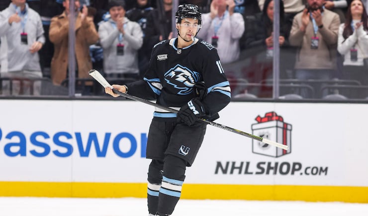 Utah Mammoth right wing Dylan Guenther (11) looks on after scoring against the Vegas Golden Knights during the first period of an NHL game at the Delta Center in Salt Lake City on Monday, Nov. 24, 2025. | Rio Giancarlo, Deseret News