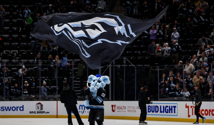 Tusky waves a mammoth flag at center ice after the Utah Mammoth defeated the Vegas Golden Knights 5-1 in an NHL game at the Delta Center in Salt Lake City on Monday, Nov. 24, 2025. | Rio Giancarlo, Deseret News