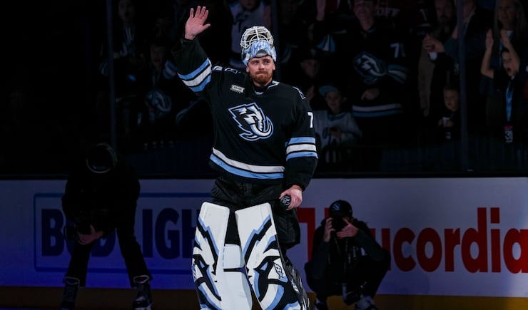 Utah Mammoth goaltender Karel Vejmelka (70) waves to fans after an NHL game against the Vegas Golden Knights at the Delta Center in Salt Lake City on Monday, Nov. 24, 2025. | Rio Giancarlo, Deseret News