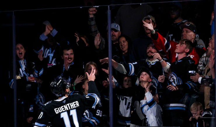 Utah Mammoth right wing Dylan Guenther (11) tosses a puck to fans after an NHL game against the Vegas Golden Knights at the Delta Center in Salt Lake City on Monday, Nov. 24, 2025. | Rio Giancarlo, Deseret News