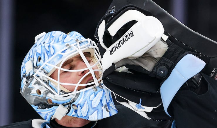 Utah Mammoth goaltender Karel Vejmelka (70) grabs a drink of water during a break in play during the second period of an NHL game at the Delta Center in Salt Lake City on Monday, Nov. 24, 2025. | Rio Giancarlo, Deseret News