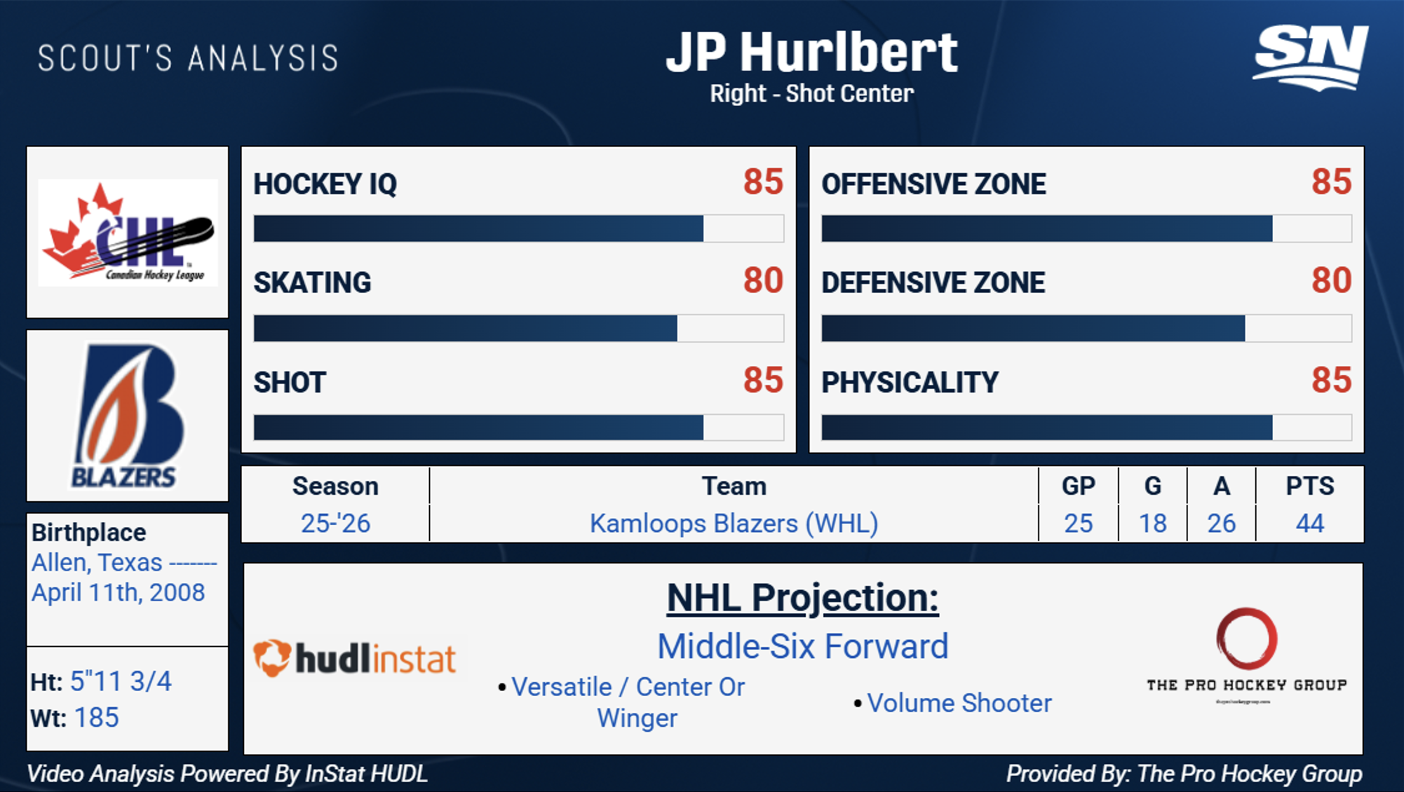 JP Hurlbert: 5-foot-11, 185 pounds, F, Kamloops Blazers, WHL